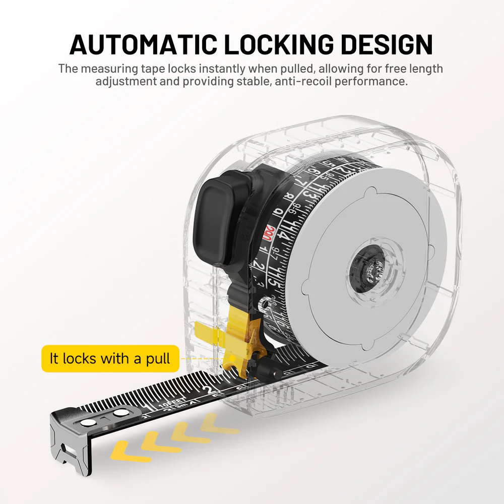 Its self-locking mechanism ensures that the tape stays firmly in place while measuring, allowing for greater convenience and precision. The compact design makes it easy to carry and store, making it an essential tool for both personal and professional use.