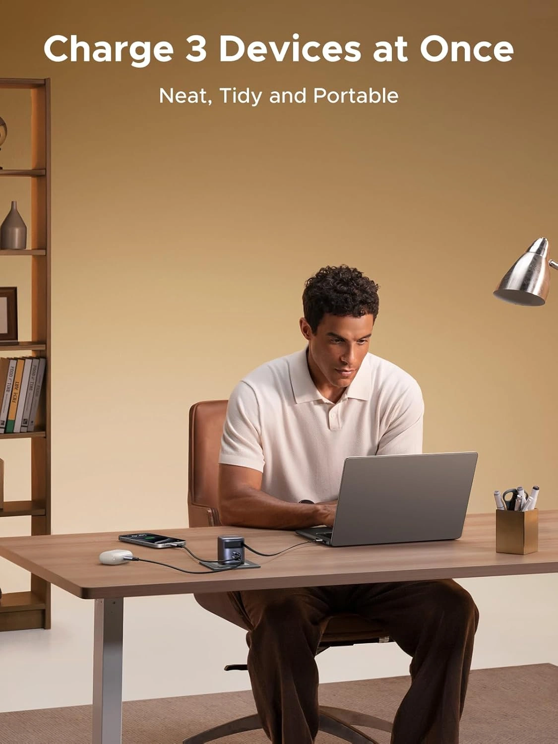 ✔ Triple charging — power your laptop, phone, and earbuds at once