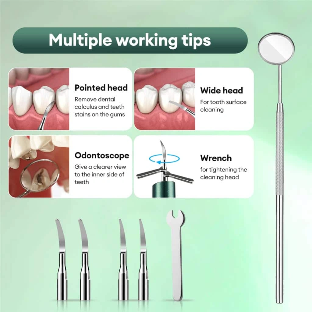 The scaler comes with three adjustable modes—Gentle, Clean, and Powerful, allowing you to choose the intensity that suits your comfort and cleaning needs. The 316F stainless steel tip ensures durability and effective cleaning performance.