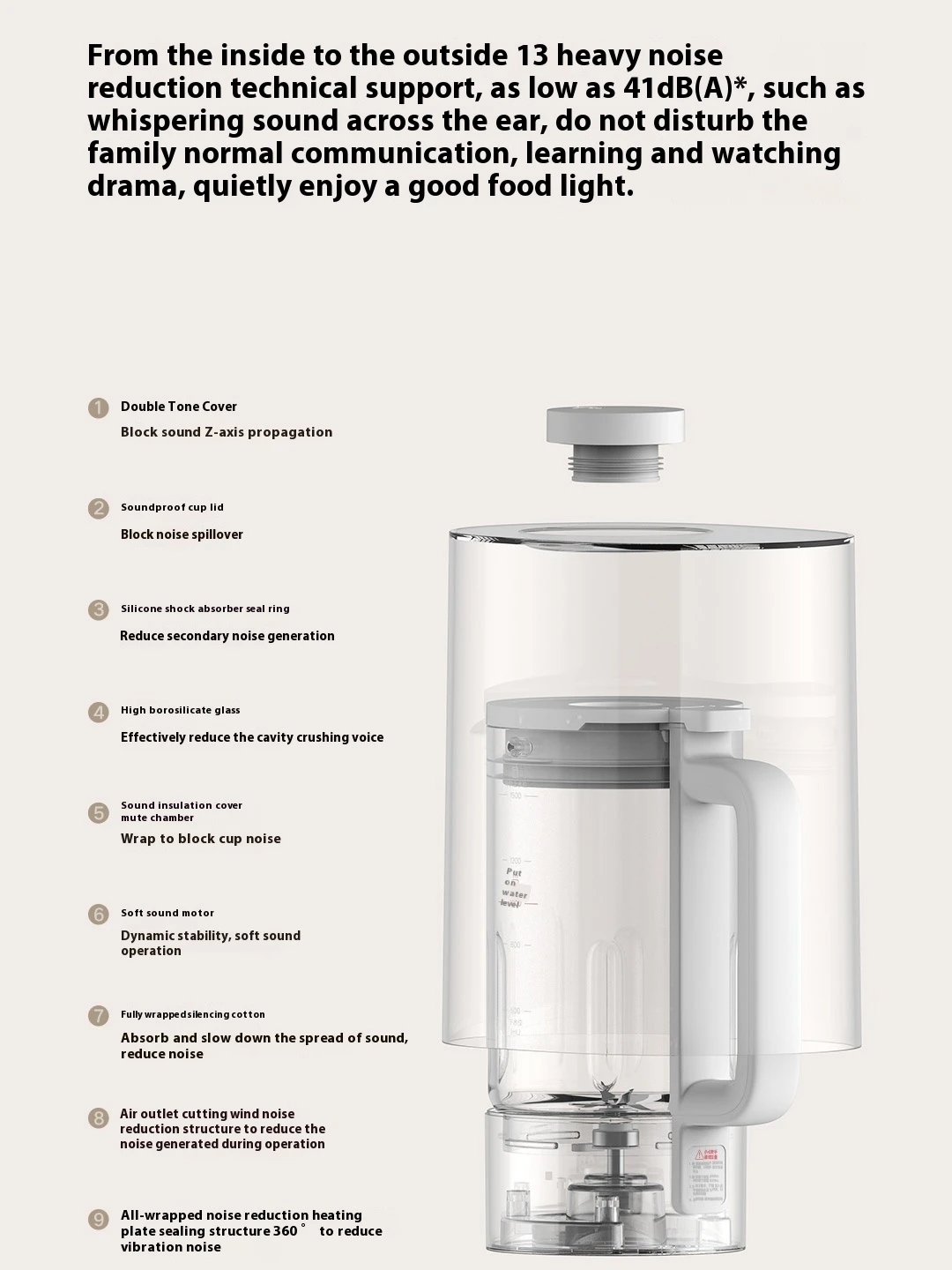 It operates at approximately 41dB, making it very quiet compared to regular blenders.